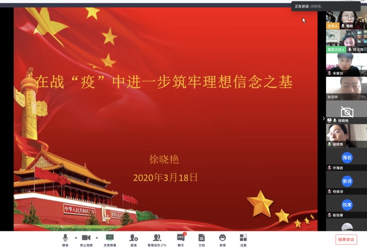 公司党委书记徐晓艳以《在战“疫”中进一步筑牢理想信念之基》为题为全体员工党员上了一堂深刻的微党课。徐晓艳希望大家透过这场战“疫”,认识到中国共产党的领导始终是战胜一切艰难险阻的关键核心、坚持和发展社会主义制度始终是实现强国复兴的根本之路、依靠和发动人民群众始终是一切工作的制胜法宝、冲锋在前的共产党员始终是紧要关头的信心信赖。徐晓艳要求全体党员在战“疫”中进一步增强四个自信,提高政治站位;进一步坚定理想信念,树立报国之志;进一步加强学思践悟,强化责任担当。她勉励同学们学会感恩、学会敬畏、学会担当、学会珍惜、学会思考、学会自律。