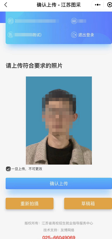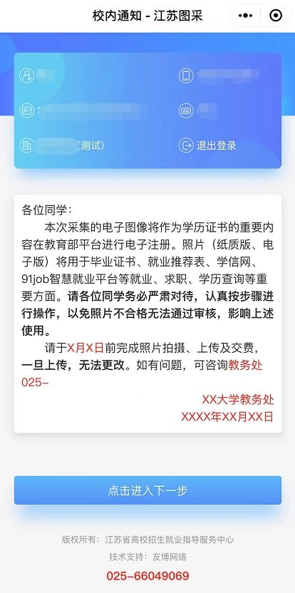 重要提示:本次采集的电子图像将作为学历证书的重要内容在教育部平台进行电子注册。照片(纸质版、电子版)将用于毕业证书、就业推荐表、学信网、91job智慧就业平台等就业、求职、学历查询等重要方面。请各位同学务必严肃对待,认真按步骤进行操作,严禁翻拍,以免照片不合格无法通过审核,影响上述使用。采集过程中,如有实际困难或遇到问题,可联系教务处刘老师,电话:0513-85012069。