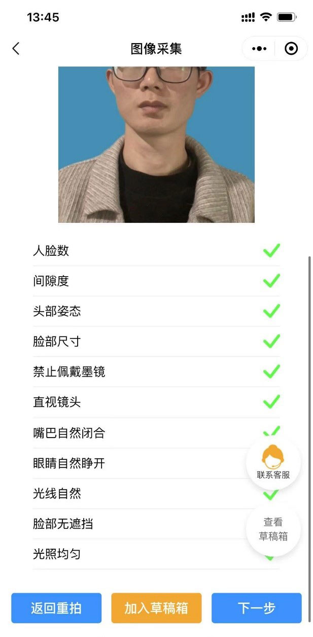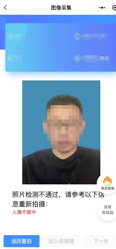 6)系统将已替换背景的照片呈现给员工,如不满意,可点击返回重拍,如满意可点击下一步,或加入草稿箱备用。