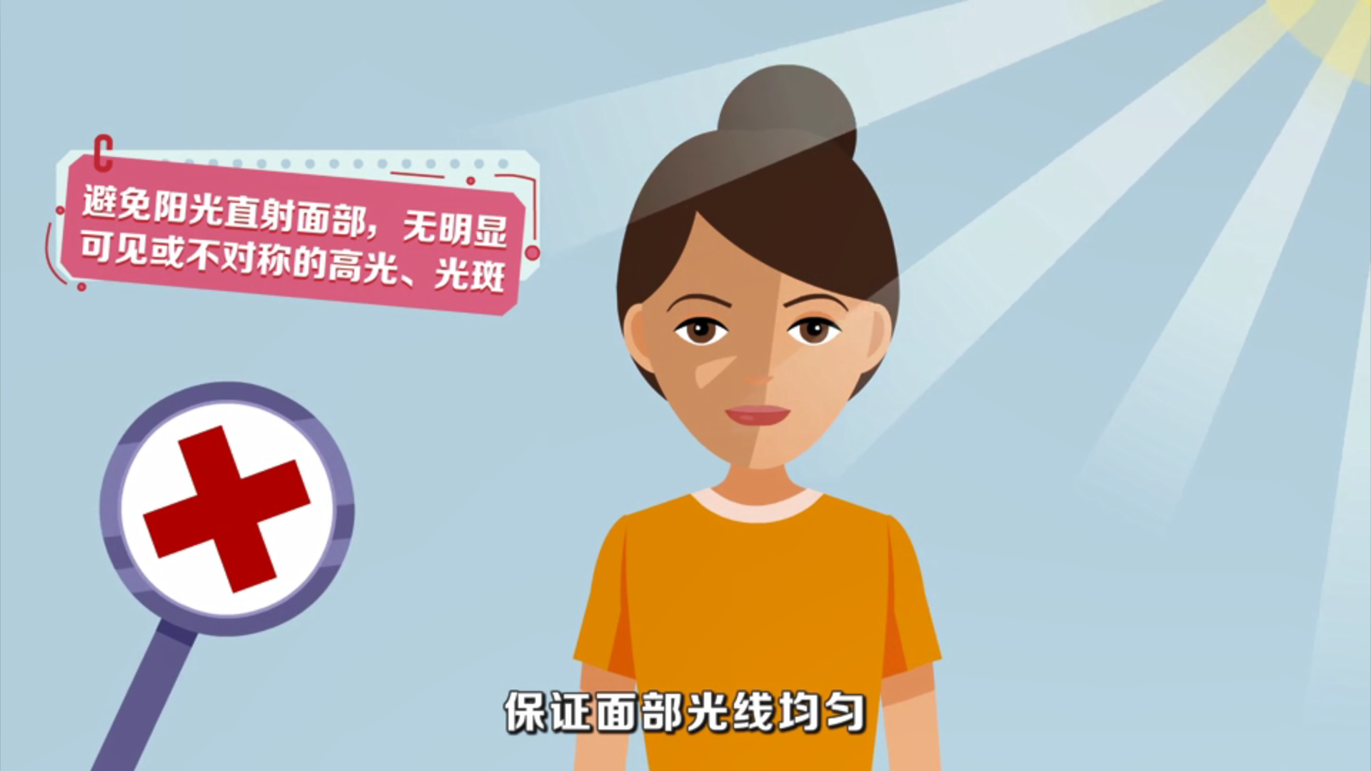 1.光线:建议面向窗户,自然光拍摄(避免阳光直射,不建议晚间拍摄),保证面部光线均匀,无明显可见或不对称的高光、光斑,无红眼。