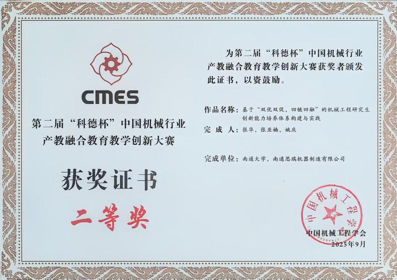 2025年9月19日至21日,由中国机械工程学会、中国机械行业卓越工程师教育联盟主办,广东工业大学承办的第二届“科德杯”中国机械行业产教融合公司产品创新大赛全国总决赛在广州举行,来自全国117所高校的137项作品从区域赛脱颖而出,进入总决赛。PlayAce游戏平台张华教授主持完成的研究生教学成果“基于‘双优双促,四链四融’的机械工程研究生创新能力培养体系构建与实践”荣获大赛二等奖。